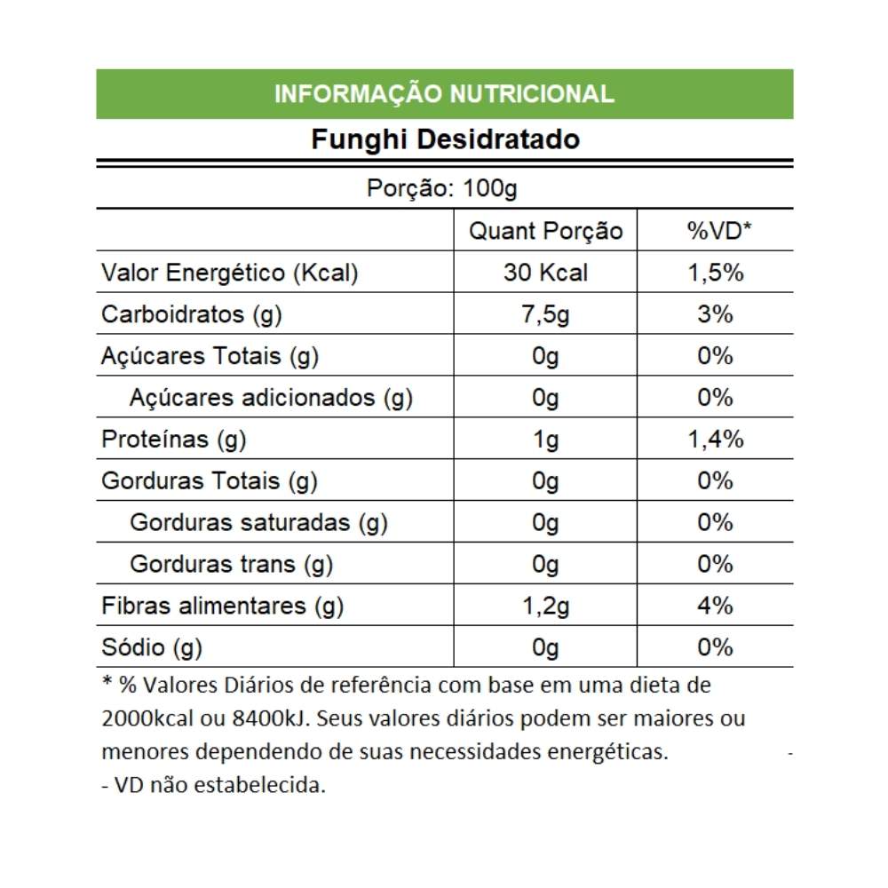 Armazenar em local fresco, seco e arejado, longe da luz solar. Havendo dúvidas sobre o consumo do Cogumelo Seco Fatiado Funghi, consulte o médico ou nutricionista, principalmente para alérgias alimentares. Contraindicado para alérgenos a cogumelos.