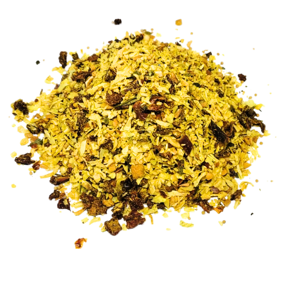 Cebola granulada, mostarda amarela grão, alho granulado, tomate flocos, sal rosa, pimentão verde em flocos, cúrcuma, óleo de soja, cebolinha desidratada, caldo de galinha, glutamato monossódico e fosfato tricálcico.